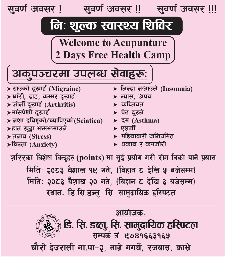 DCWC Community Hospital lies in Nagre Gagarche, Chaurideurali - 2, Rural Municipality, Rajbash in Kavre District of Nepal. It is 15 beds Hospital and in operation since 2010. It has good number of medical staffs lead by Medical Doctor and well equipped with X-ray, Lab Facilities, Pharmacy, 24 hour Emergency, OPD and In Patient services. In addition 24/7 Ambulance Service. The extension and improvement plans are still in progress.