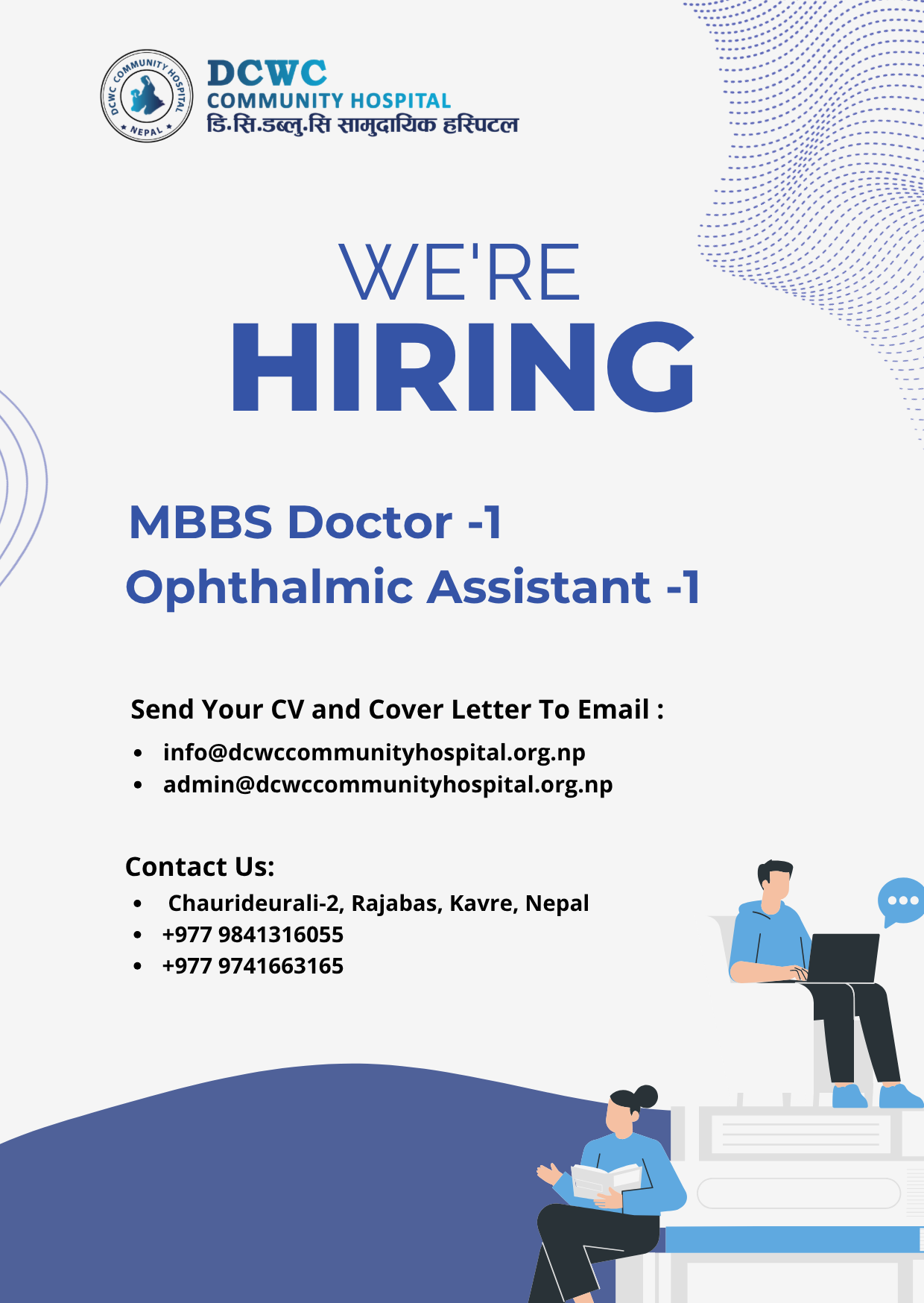 DCWC Community Hospital lies in Nagre Gagarche, Chaurideurali - 2, Rural Municipality, Rajbash in Kavre District of Nepal. It is 15 beds Hospital and in operation since 2010. It has good number of medical staffs lead by Medical Doctor and well equipped with X-ray, Lab Facilities, Pharmacy, 24 hour Emergency, OPD and In Patient services. In addition 24/7 Ambulance Service. The extension and improvement plans are still in progress.