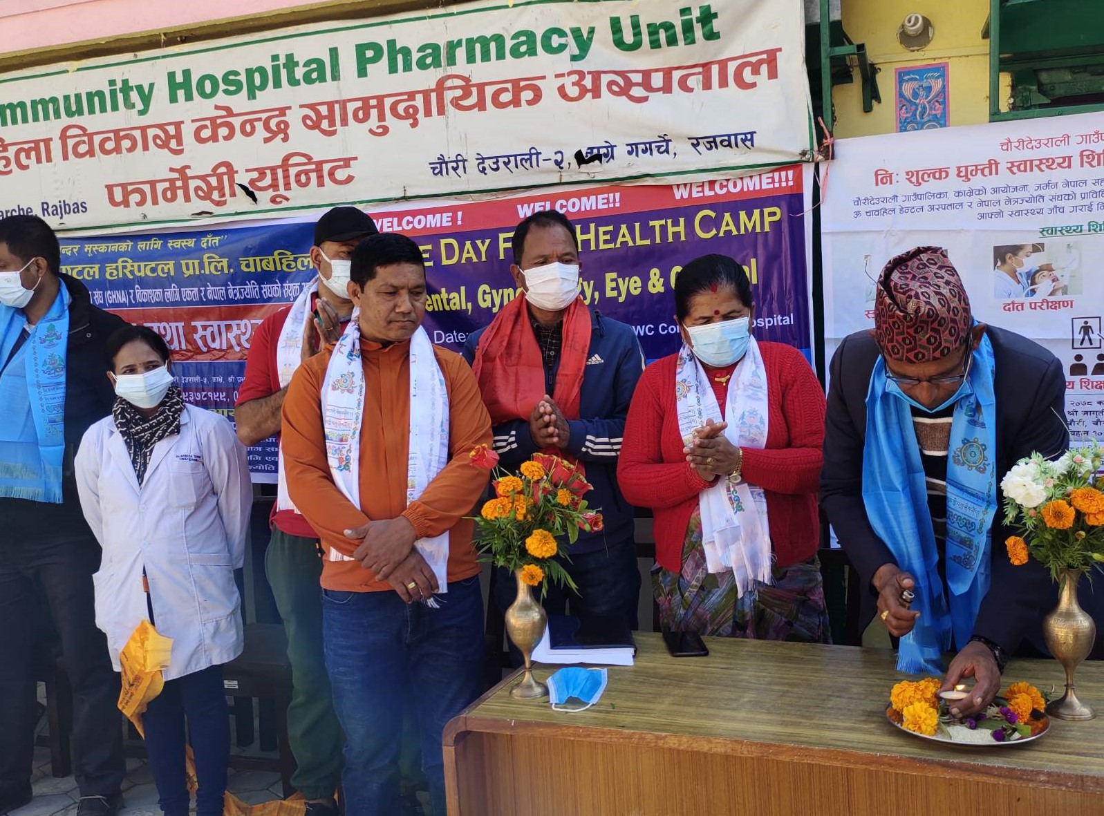 It was a mobile Health Camp which took place in DCWC Community Hospital on the 1st day and then in other 2 Venues. At the hospital we provided lodges and food for 22 people altogether (Medical teams and Government People).Financial Support from German Nepal Help Association (GNHA) and Technical Support from Om Chabhel Dental Hospital and Nepal Netra Jyoti Association